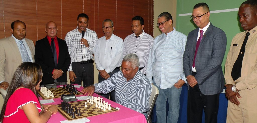 Aníbal Portorreal, viceministro de Deportes Administrativo (MIDEREC), mueve la primera pieza, frente a Geraldina Ramírez actual campeona nacional de Ajedrez Juvenil Femenino.