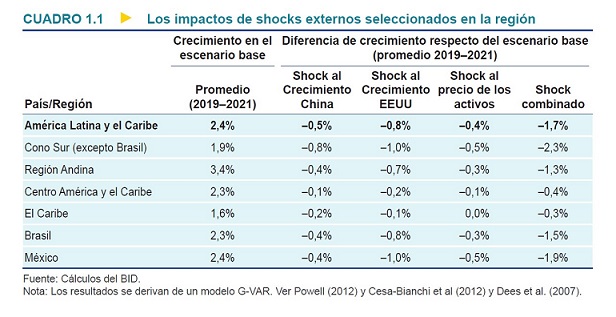 El informe calcula los impactos de un crecimiento desacelerado de las economías de Estados Unidos y China, y un aumento en las tasas de interés de Estados Unidos. También evalúa los potenciales impactos sobre América Latina y el Caribe causados por un Brexit desordenado (salida del Reino Unido de la Unión Europea sin haber logrado un acuerdo), que podría reducir en medio punto porcentual adicional las proyecciones de crecimiento de la región.