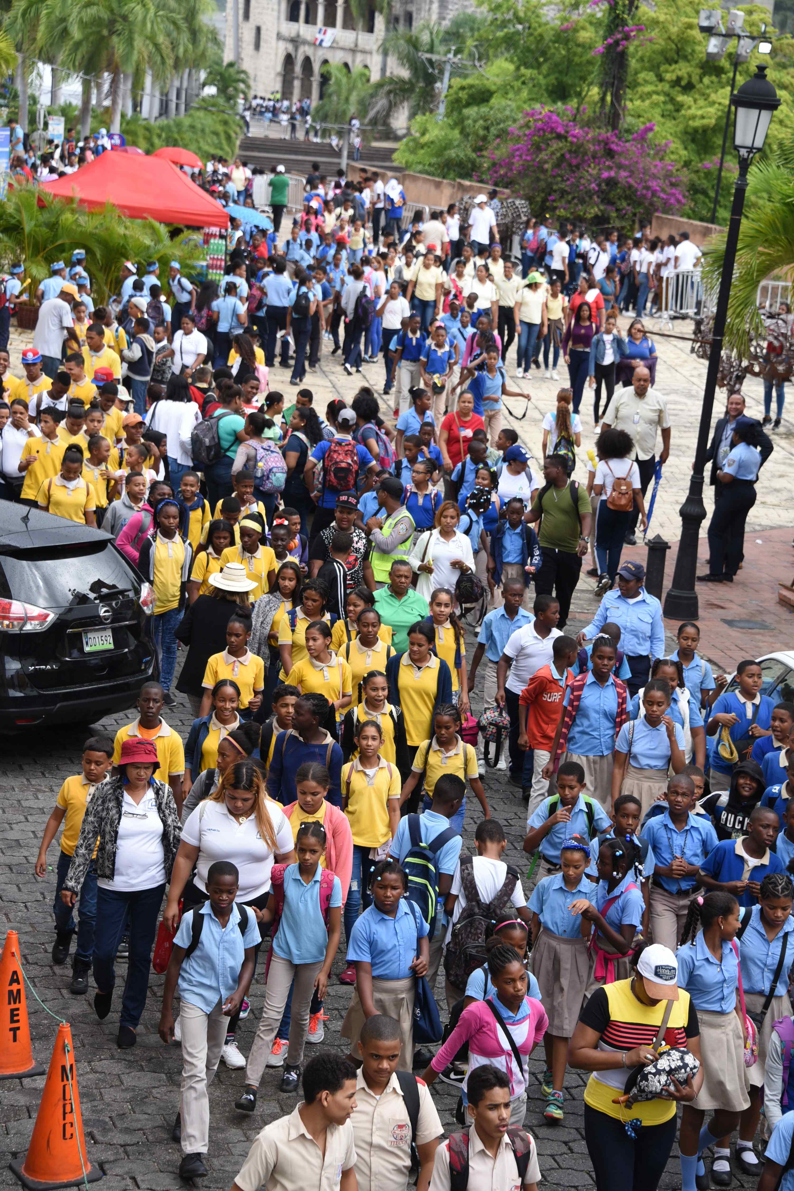 Los alumnos que llegan en autobuses a la Ciudad Colonial de Santo Domingo visitan pabellones, stands y museos a los que tienen acceso gratis.