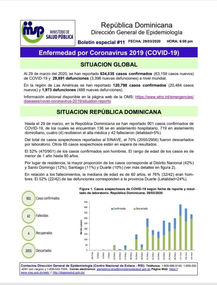 Los casos de coronavirus Covi-19 positivos aumentaron a 901 y los fallecidos a 42 informó este lunes el ministro de Salud Pública, Rafael Sánchez Cárdenas.