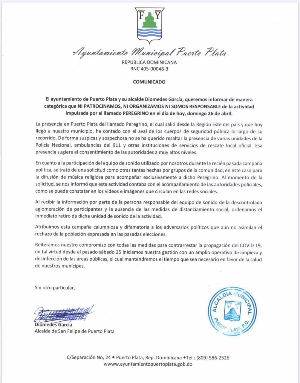 La entidad edilicia puertoplateña emitió un comunicado, copia del cual remitiera a DiarioDigitalRD, en el que se desliga de la acción. El Peregrino hizo la convocó el acto para presuntamente anunciar el fin del coronavirus Covi-19, que ha causado miles de muertos en el mundo.