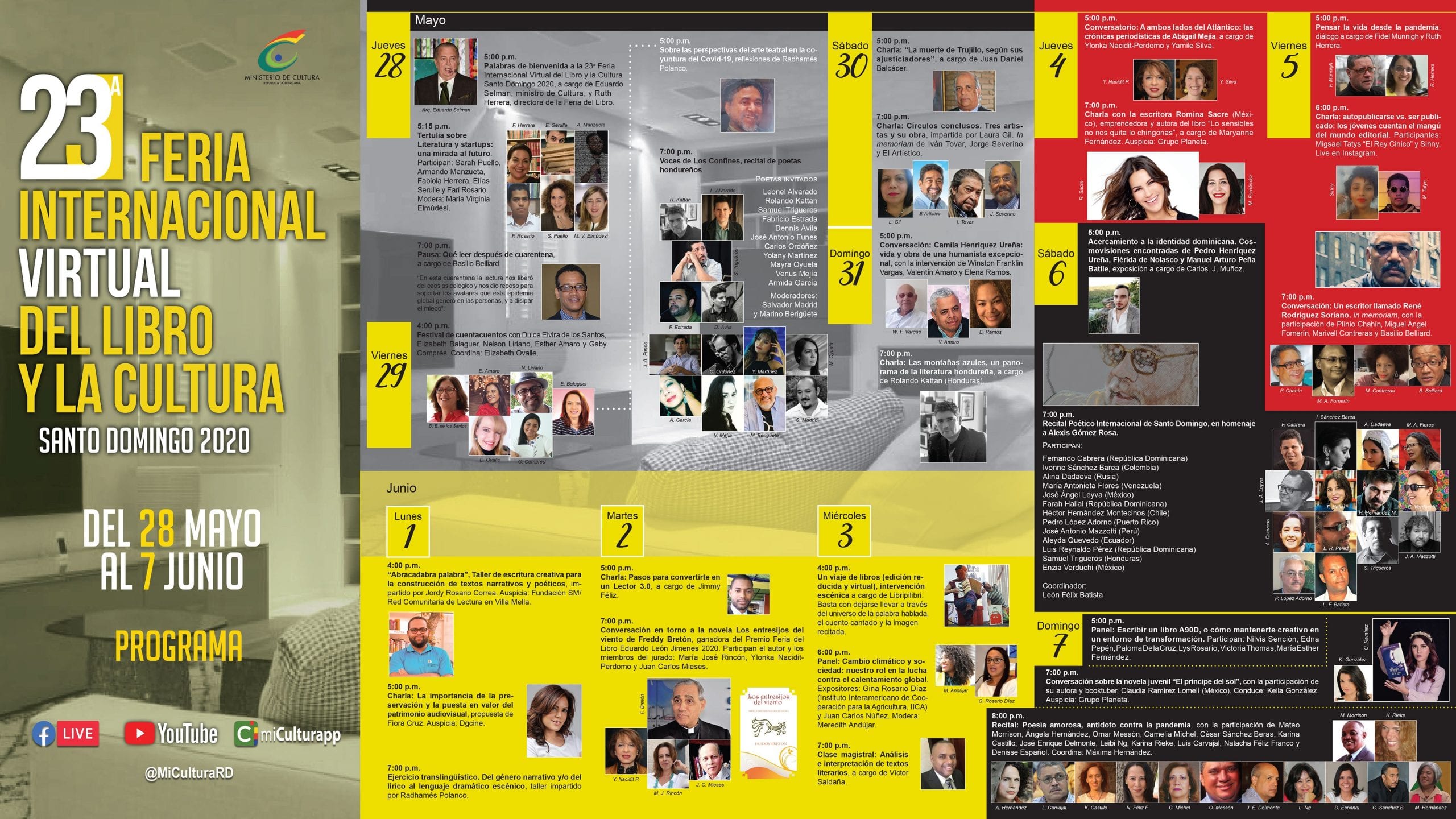 La Feria Internacional Virtual de Libro y la Cultura está fijada para concluir el domingo 7 de junio y se desarrollará por las plataformas YouTube y Facebook Live, en horarios de 4 de la tarde hasta 8 de la noche. Las convocatorias se estarán difundiendo a través de las redes sociales del MINC: Instagram, Twitter, Facebook, con el nombre @miculturard. Los interesados pueden obtener más informaciones en http://www.cultura.gob.do/