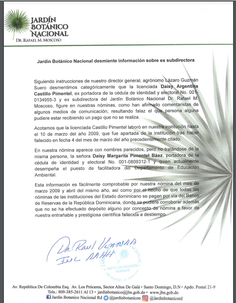 Siguiendo instrucciones de nuestro director general, agrónomo Lázaro Guzmán Suero desmentimos categóricamente que la licenciada Daisy Argentina Castillo Pimentel, ex portadora de la cédula de identidad y electoral No. 001-0134955-3 y ex subdirectora del Jardín Botánico Nacional Dr. Rafael M. Moscoso, figure en nuestras nóminas, como han afirmado comentaristas de algunos medios de comunicación; resultando falaz el que persona alguna pudiere estar recibiendo un pago que no se realiza.