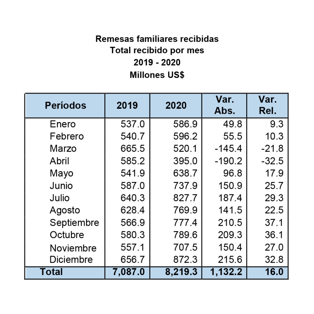 Particularmente, para el mes de diciembre, el flujo de remesas que ingresó al país alcanzó los US$ 872.3 millones, valor superior en US$215.6 millones (32.8 %) al registrado en el mismo mes del año anterior, cuando fue de US$656.7 millones.