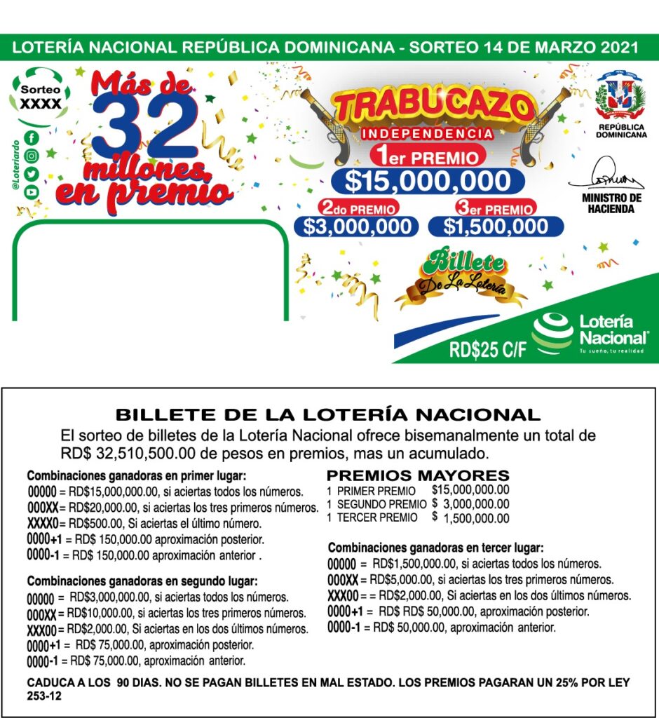 Santo Domingo. Con alrededor de 32 millones de pesos en premios, la Lotería Nacional informa el relanzamiento de su histórico billete con una promoción denominada el “Trabucazo de Independencia”.