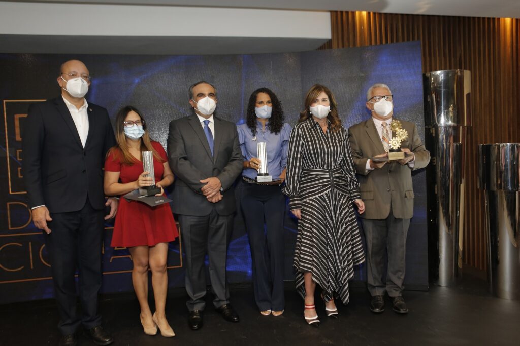 El director general de Pronindustria, Ulises Rodríguez, Celso Juan Marranzini y Cirse Almanzan junto a los ganadores del premio.