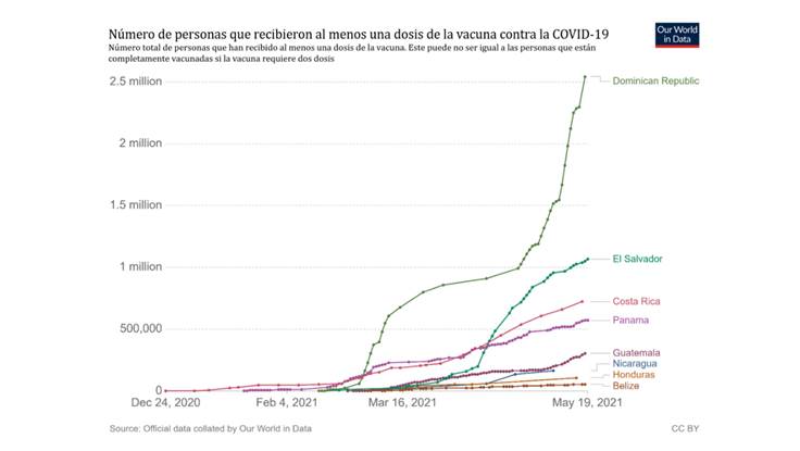 De acuerdo con la Universidad de Oxford, al 19 de mayo de 2021, Panamá reportó que la cantidad de personas vacunadas con su primera dosis fue de 570,640 y en El Salvador de 1,070,000. El 18 de mayo, Belize contabilizó a 54,949; Guatemala 305,764; y República Dominicana 2,550,000.