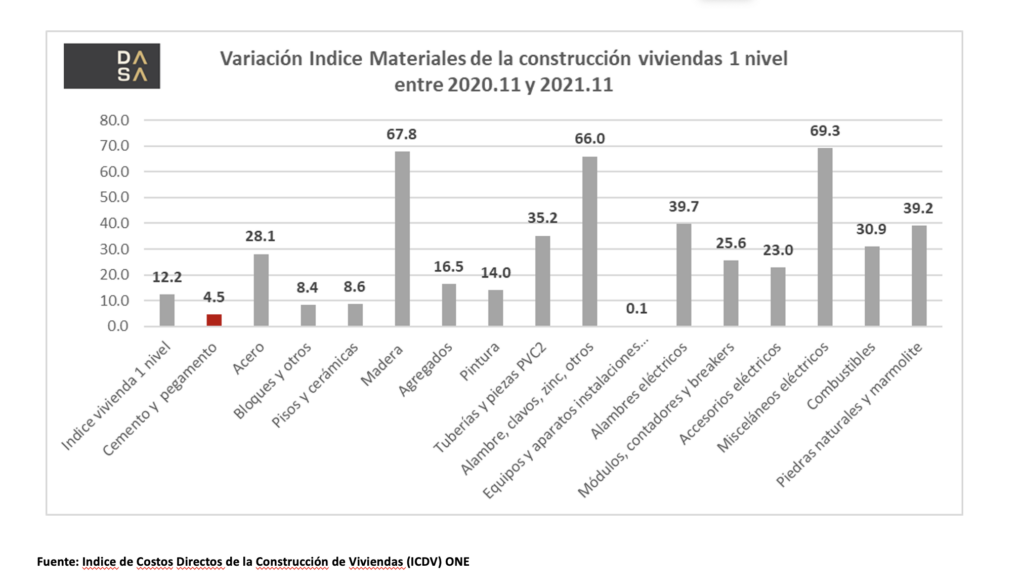 Acorde a un análisis llevado a cabo por la empresa de consultoría económica DASA, tomando como base el Índice de costos directos de la construcción de viviendas que publica la ONE se resalta que de noviembre 2020 a noviembre 2021 el cemento es uno de los insumos para lo construcción con el menor incremento de precios durante el último año (4.5%), a pesar de que los costos de producción han incrementado en más de un 40 %.
