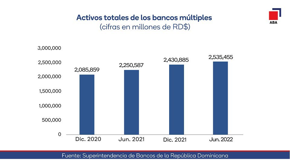 Santo Domingo, Rep. Dom.- Los activos totales de la banca múltiple alcanzaron los RD$2 billones 535,455 millones a junio de 2022, al reflejar un aumento en términos absolutos de RD$104,569.8 millones y en términos relativos del 4.3%, informó la Asociación de Bancos Múltiples de la República Dominicana (ABA).