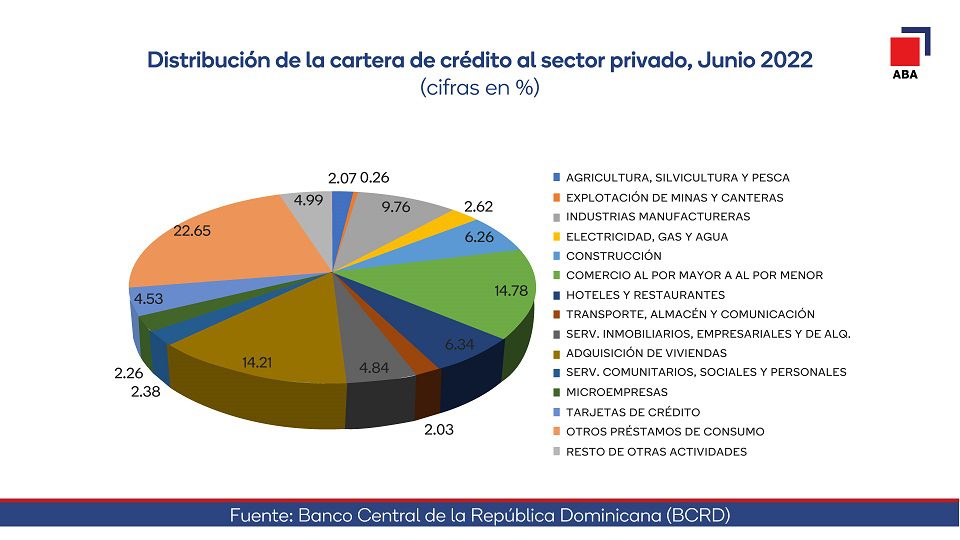 La ABA precisó que, dentro de la cartera total, el crédito al sector privado aumentó en RD$73,139 millones, mostrando un incremento de 6.3% durante el primer semestre del año, apoyado principalmente por la canalización de recursos destinados a la adquisición de viviendas, hoteles y restaurantes, préstamos de consumo, comercio al por mayor y al por menor, industria manufacturera, microempresas, construcción; electricidad, gas y agua, entre otros sectores.
