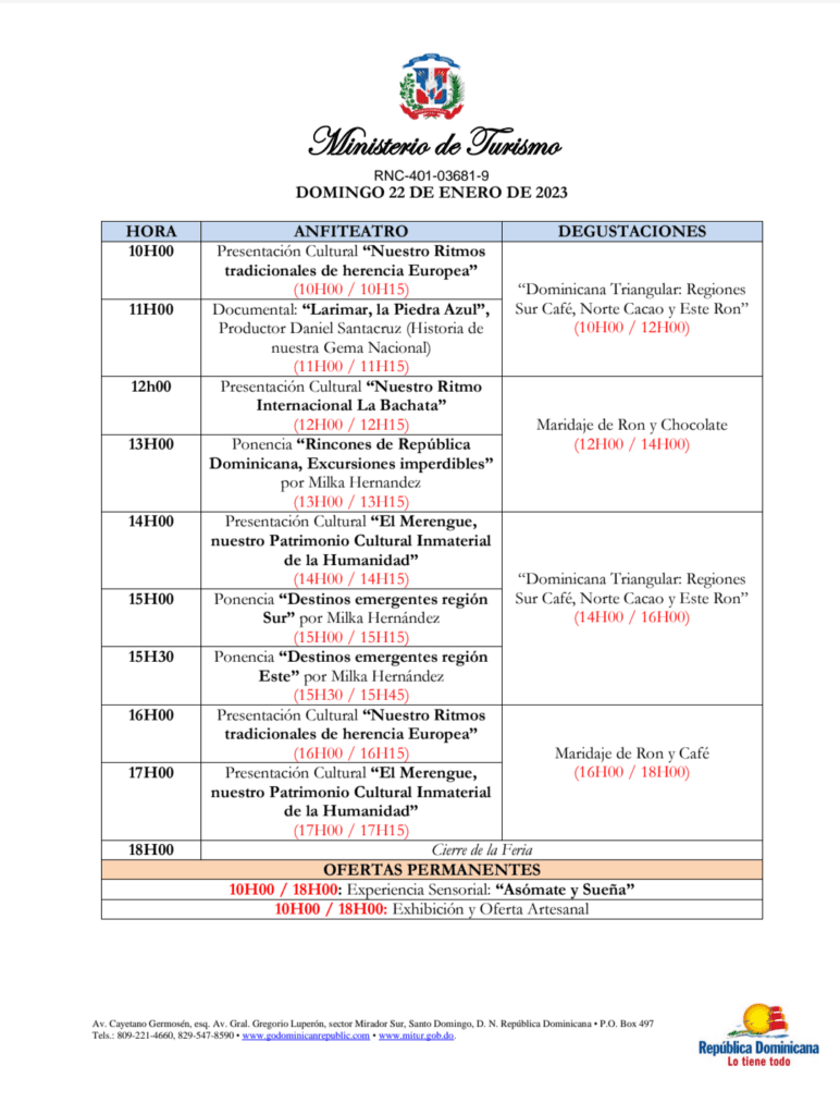 La partida tuvo lugar luego de una intensa jornada del viernes, de anuncios de acuerdos alcanzados en Fitur, tanto por los ejecutivos de bancos dominicanos, que anunciaron haber concertado acuerdo de inversión en el sector turismo del país, y el propio Ministerio de Turismo, cuyo titular David Collado se retiró de la Fitur 2023 colmado de optimismo por los logros de la delegación.