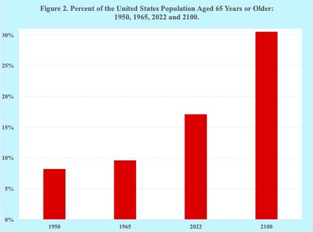 Porcentaje de la población de Estados Unidos con 65 años o más: 1950, 1965, 2022 y 2100. Fuente: Naciones Unidas