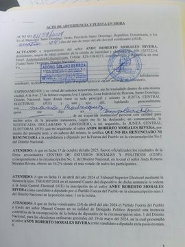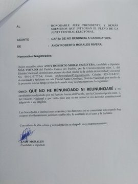 En una declaración pública emitida esta mañana, Andy Morales, candidato a Diputado por la Fuerza del Pueblo ha notificado formalmente a la Junta Central Electoral que no ha renunciado ni renunciará a sus derechos constitucionales, según lo establece la Constitución de la República Dominicana.
