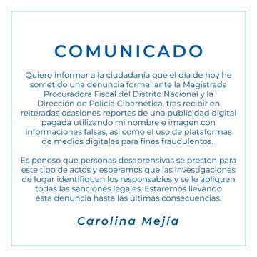 Santo Domingo.- La alcaldesa del Distrito Nacional y secretaria general del Partido Revolucionario Moderno (PRM), Carolina Mejía, presentó una denuncia formal ante la Magistrada Procuradora Fiscal del Distrito Nacional y la Dirección de Policía Cibernética. La querella responde al uso indebido de su nombre e imagen en una publicidad falsa que ha circulado en las redes sociales, según un comunicado emitido por la edil.