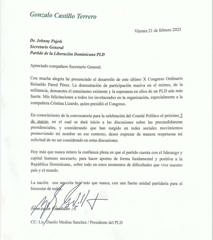 Santo Domingo.- Gonzalo Castillo Terrero, ex candidato presidencial del Partido de la Liberación Dominicana (PLD) en los comicios del 2020 solicitó en carta pública no ser considerado en las discusiones de precandidaturas presidenciales que se llevarán a cabo en el próximo Comité Político del partido. Este anuncio se produce en medio de un creciente movimiento en redes sociales que promovía su nombre como posible candidato.