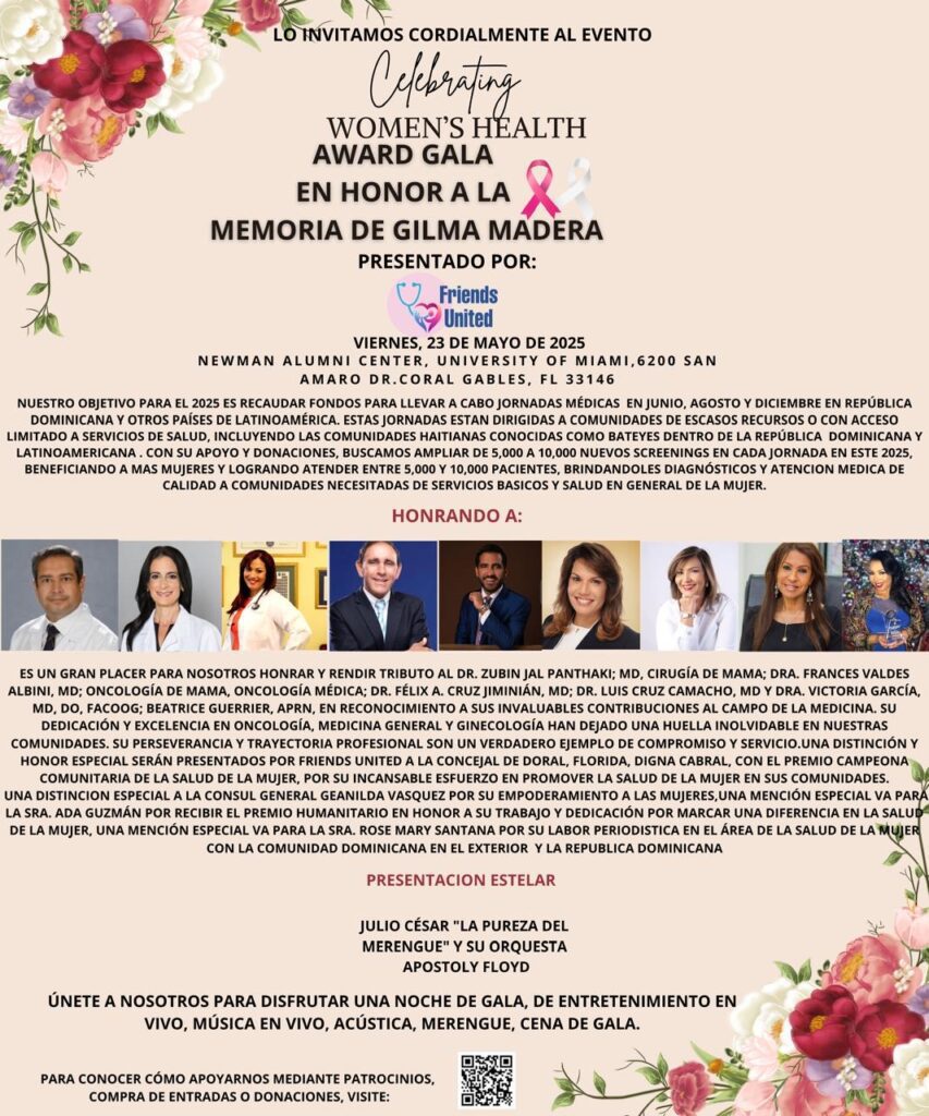 Miami, Florida. – Friend United For Health y la Universidad de Miami, anuncian la tradicional Gala filantrópica para fortalecer sus programas de prevención y tratamientos de cáncer que anualmente favorecen entre 5 y 10 mil mujeres en República Dominicana y otros países en AL y el Caribe, con diagnósticos, medicamentos, asistencia y tratamientos, en cuyo marco de la actividad el próximo 23 de mayo, serán reconocidos médicos y personalidades vinculadas al sector salud.