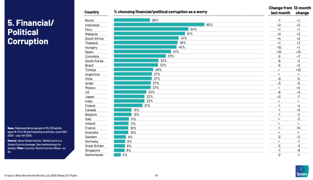 La corrupción financiera y política aparece en el radar de un 26% de los encuestados. Aunque la cifra global se mantiene estable, algunos países registran movimientos bruscos. España, por ejemplo, experimentó un aumento de diez puntos en solo un mes, alcanzando el 41%. En América Latina, Perú, Colombia y Brasil aparecen en los primeros lugares del ranking global, confirmando que la corrupción sigue siendo uno de los males más difíciles de erradicar.